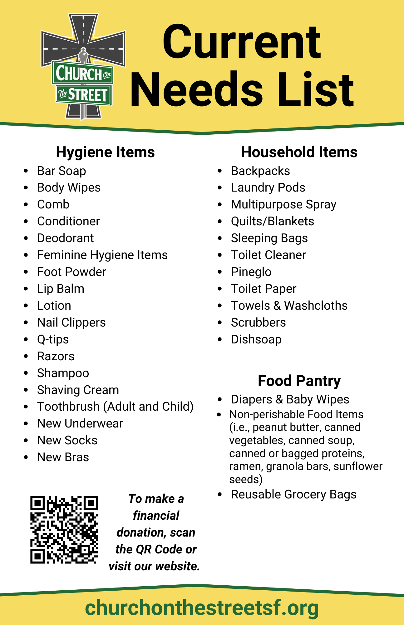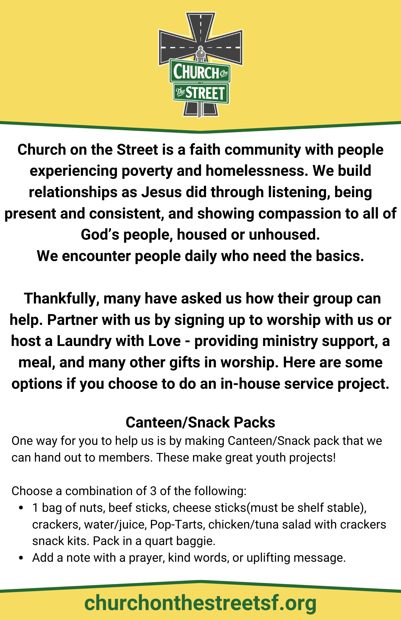 We encounter people daily who need the basics. Thankfully, many have asked us how their group can help. Partner with us by signing up to worship with us or host a Laundry with Love - providing ministry support, a meal, and many other gifts in worship. Here are some options if you choose to do an in-house service project.